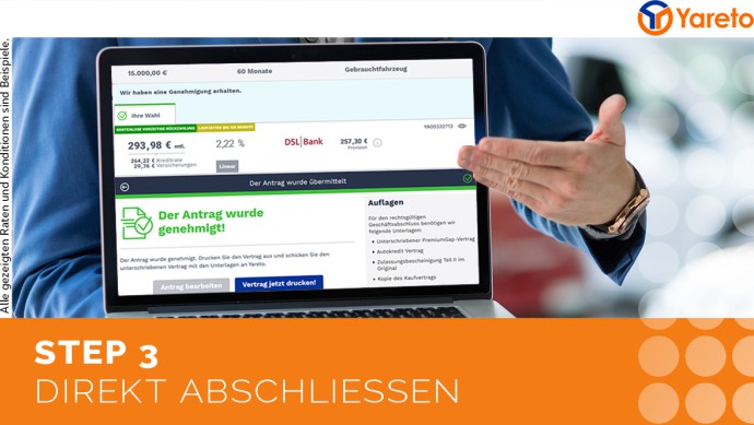 Auf Yareto.de können Sie als Verkäufer oder Händler mit nur wenigen Klicks herausfinden, welcher Kredit individuell am besten zu Ihnen und Ihren Kunden passt. Zins, Laufzeit, Restrate, Provision: Ein Vergleich aus über zehn Banken klärt die Konditionen. Damit hilft Yareto jeden Tag, die Vorteile der Digitalisierung ganz konkret auf Ihren Schreibtisch zu bringen. Mehr als 14.500 Händler haben sich davon schon überzeugen lassen und nutzen Yareto in ihrem Tagesgeschäft.
