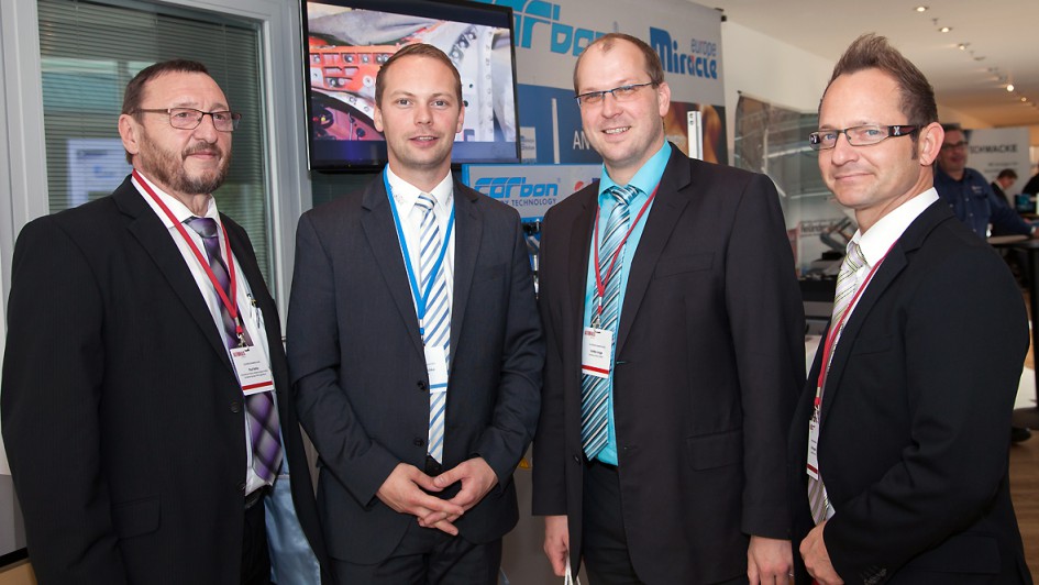 von 17: Paul Kehle, Vors. Bundesfachgruppe Fahrzeuglackierer, Stephan Paschke, Carbon, Veikko Junge und Dirk Morgenthal, beide Autohaus Peter (v. l.)