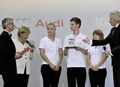 von 21: Nach ihrer Festrede überreichten Audi-Azubis der Kanzlerin ein Geschenk.
