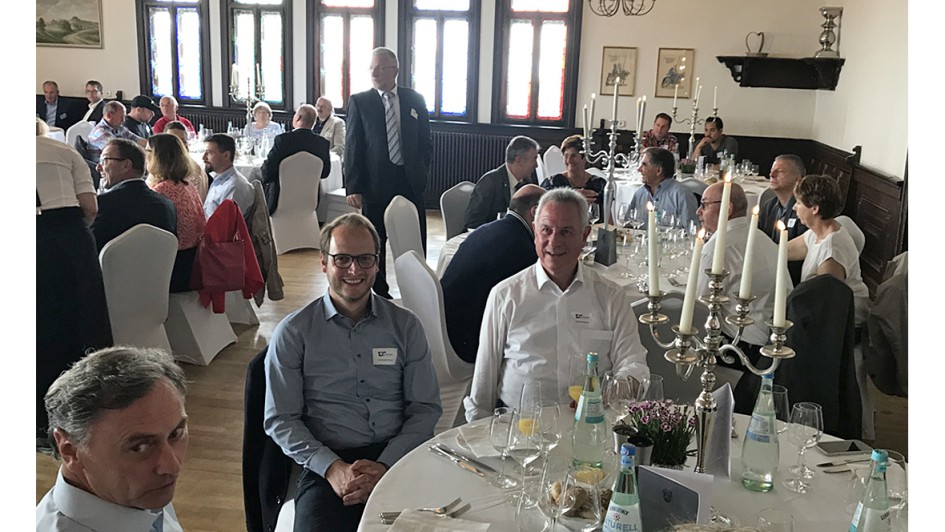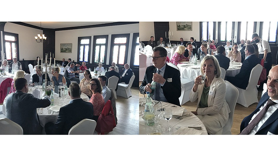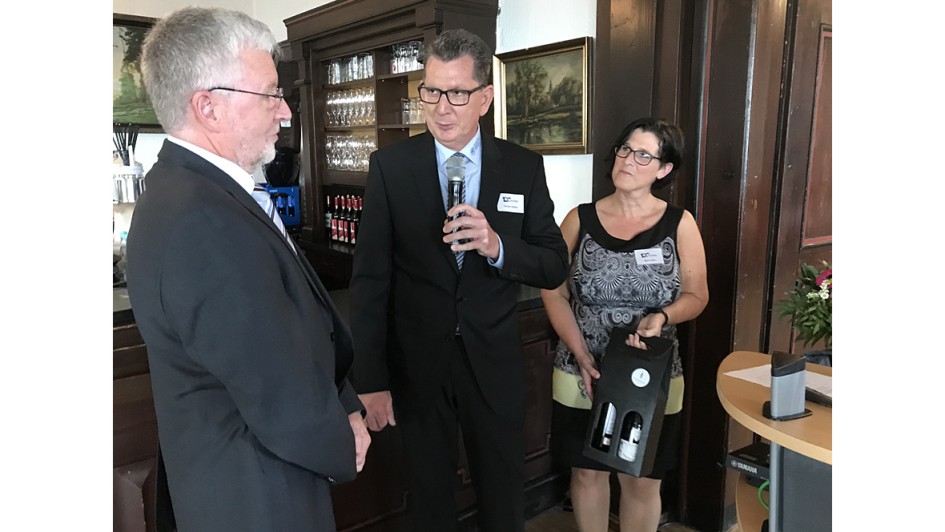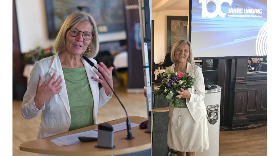 von 12: Obermeister Carsten Müller (Lich; Mitte) zeigte in seiner Eröffnungsrede die historischen Stationen der größten hessischen Innung auf. Müller fungiert seit 2018 als achter Obermeister in der Innungsgeschichte. Er verwies auf die Bedeutung des Ehrenamtes, das seit 100 Jahren dazu beigetragen hat, die Betriebe fit für die Zukunft zu machen. Das reicht aktuell vom digitalen Berichtsheft, dem Junggesellenwettbewerb, der Akkreditierung zur HU bis zur Schiedsstelle, die fünf Mal pro Jahr tagt. Auch die Teamarbeit im Ehrenamt war dem Obermeister besonderes Anliegen. Sein besonderer Dank galt seinem Vorgänger Hans-Joachim Beranek (Bad Nauheim), der sieben Jahre lang als Obermeister die Kfz-Innung geführt hat. Agnes Huhn, Abteilungsleiterin in der KH Gießen, steuerte gleich mehrfach Blumensträuße und "liquide Gaben" bei. Huhn hat auch als Lektorin der neuen Innungs-Chronik einen wichtigen Beitrag geleistet.