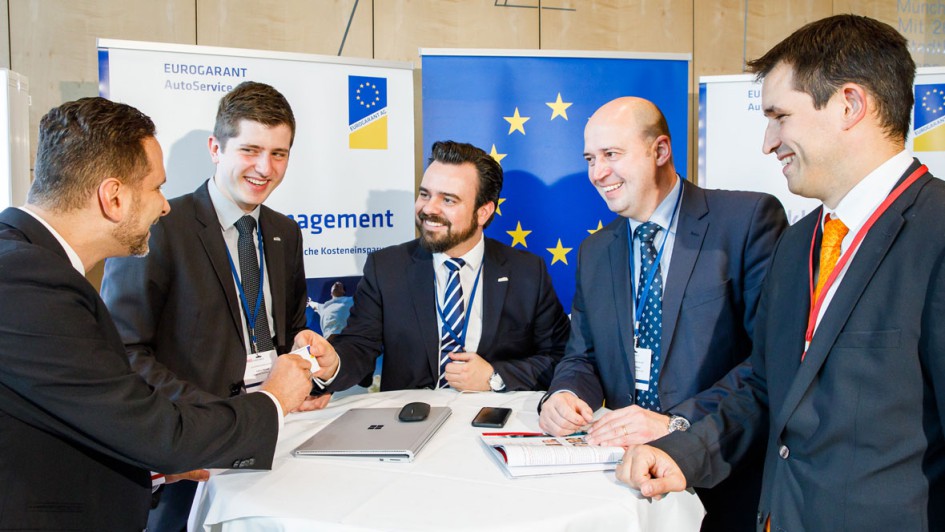von 17: Julius Hensel (2.v.li.), Marc Loibl (Mi.) und Guido Kalter (2.v.r.) präsentierten unter den Augen von Christian Ciupka (Sixt, re.) die gesamte Angebotspalette der Eurogarant AutoService AG gewohnt sympathisch.