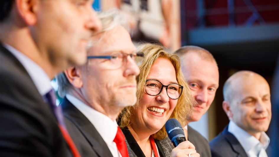 von 17: Wie sieht das Schadenmanagement der Zukunft aus? Antworten lieferte die Podiumsdiskussion mit (v.l.n.r.): Rechtsanwalt Christian Janeczek, SSH-Geschäftsführer Michael Jänchen, Daniela Dux (Abteilungsleiterin Unfallmanagement Leaseplan Deutschland), ZKF-Präsident Peter Börner und Matthew Whittall, Vorsitzender des Vorstandes Innovation Group. Im Bild fehlt Thomas Geck, Leiter Schaden Prozessmanagement HUK-COBURG Versicherungsgruppe.