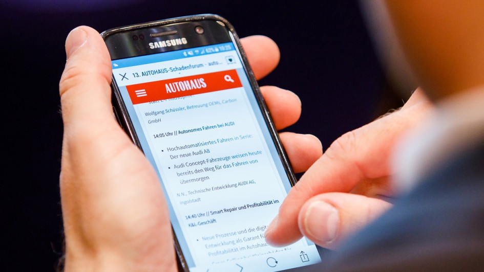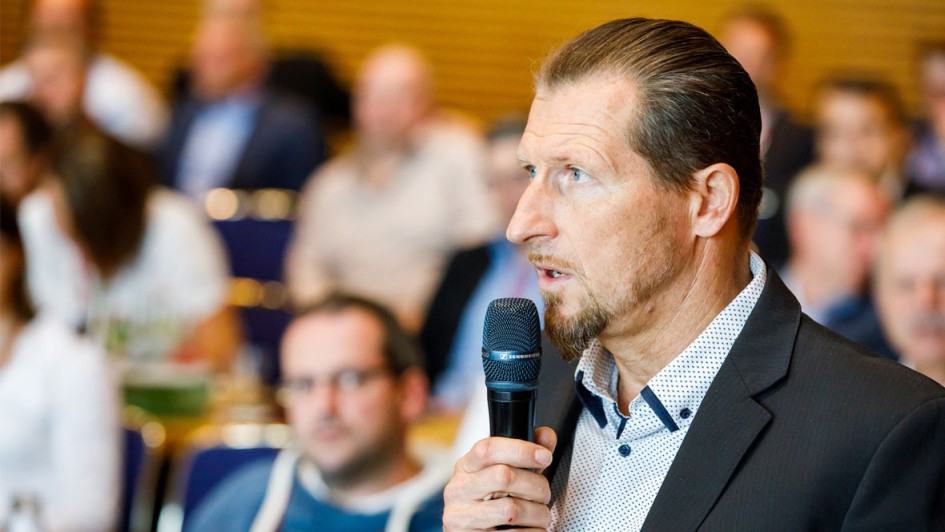 von 17: Auch die diesjährige Ausgabe des AUTOHAUS Schadenforums war geprägt von der Interaktion mit dem Fachpublikum. Hier nutzt Tiemo Sehon, Geschäftsführer des Anbieters von innovativen Lackieranlagen, die Möglichkeit zur Nachfrage beim Referenten.