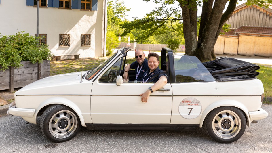 von 14: Die "Blues Brothers" lassen grüßen: Philipp Kroschke (Kroschke Gruppe; r.) und Robert Lasek (AUTO1 Group) sorgten mit ihrem Dodge Monaco für Aufsehen.