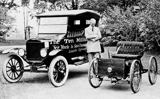 von 8: 1924: Henry Ford mit einem 1896er Quadricycle und dem 10-millionsten Ford-Auto, einem T-Modell.
