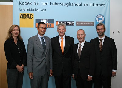 von 6: Präsentierten gemeinsam den neuen Internet-Kodex, v. li.: Silvia Schattenkirchner (ADAC), Dr. Nicola Carbonari (Autoscout 24), Stefan J. Gaul (mobile.de), Dr. Andreas Ottofülling (Wettbewerbszentrale) und Ulrich Dilchert (ZDK)