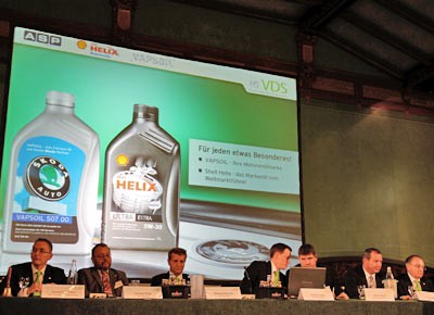 von 18: Auf dem Podium (v.l.): Jochen Schandert (AK Vertrieb und Marketing), Günther Rube (AK Service), Händlerverbandspräsident Thomas Peckruhn, Geschäftsführer Patrick Kaiser, Kersten Borst (AK Betriebswirtschaft), Hans Mette (AK Service) und Andreas Müller. Skoda-Händlerverband, Vapsoil und Shell haben ihre Kooperation vertieft.