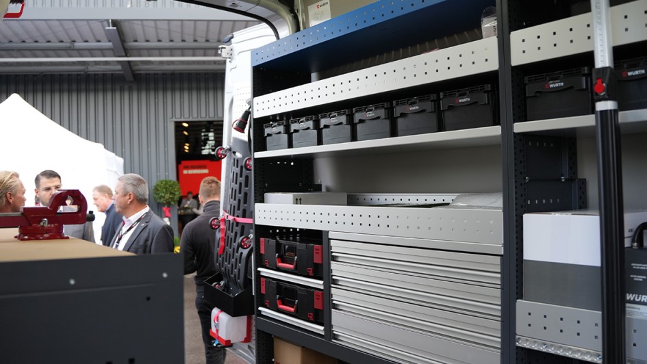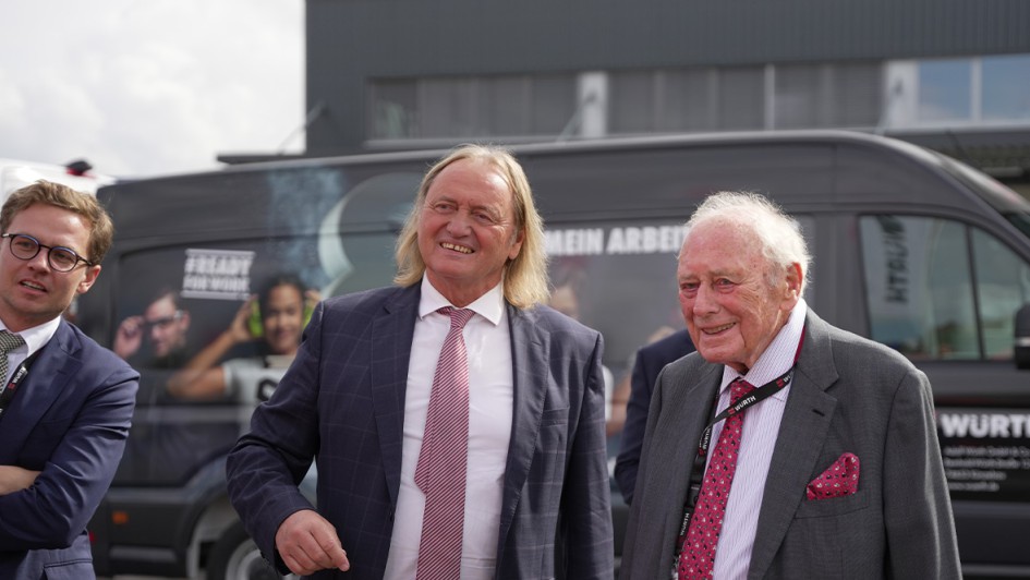 von 6: Christian Würth (links), Bereichsleiter Services und Systeme der Adolf Würth GmbH & Co. KG, und Martin Schäfer (Mitte), Geschäftsführer Fahrzeugeinrichtungen der Adolf Würth GmbH & Co. KG, zeigen Reinhold Würth, Vorsitzender des Stiftungsaufsichtsrats der Würth-Gruppe, die Würth Fahrzeugeinrichtungen.