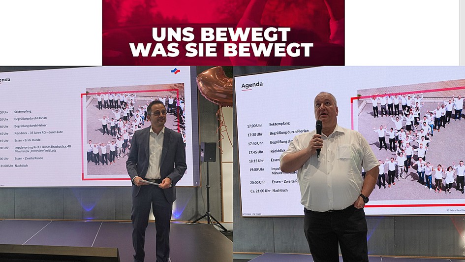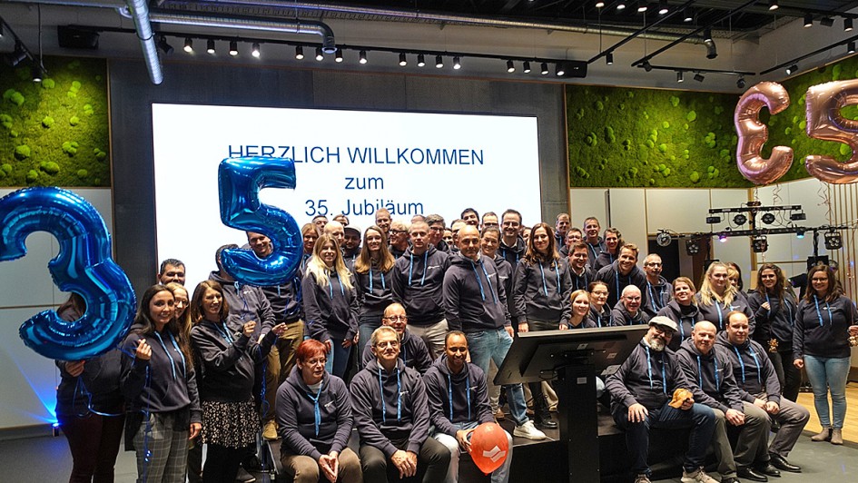 von 9: Damit der Abend auch emotional transparent wird, hat Florian Rohkamm in launiger Art die einzelnen Stationen moderiert (ob. li.). Betriebsratsvorsitzender Heiner Klein reflektierte die Gesamtschau der 35 Jahre als "tolle Zeit". Bei allen Phasen der Stagnation, darf das Unternehmen in den letzten zwölf Jahren auf respektables Wachstum zurückblicken. Er hob die vielen Aufgaben im Innendienst heraus und lobte gleichermaßen, was in der Geschäftsführung und im Verkauf auf die Branchenschiene gesetzt wurde.