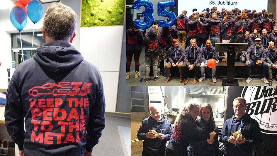 von 9: Der Slogan der Jubel-Botschaft: "Keep the pedal to the metal", schwäbisch interpretiert: Mensch, gib Gas! Nicht reden, tun! Das wurde mit verschiedenen Offerten der Stärkung, von Maultaschen über Handfood bis zu speziellen, individuell angefertigten Burger gestaltet. Die Vielzahl der Damen im Real Garant-Team beteiligten sich auch daran aktiv.