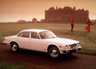 von 8: Die XJ Serie II (1974-1979), hier standesgemäß im schottischen St. Andrews, hatte durch US-Crash-Vorschriften eine höher angebrachte vordere Stoßstange und einen schmalerem Grill.
