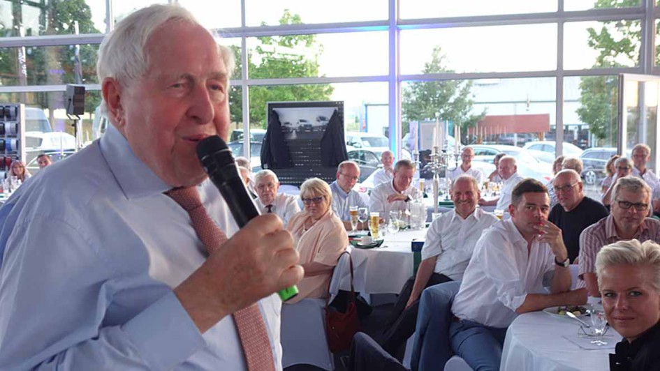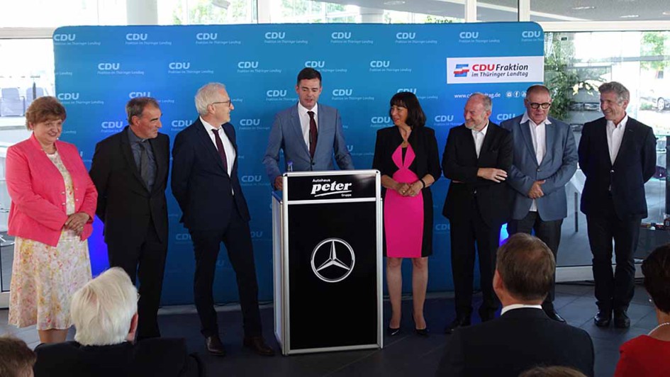 von 17: Helmut Peter postulierte einmal mehr ein Exemplum, wie man im Autohaus Eventcharakter zaubert. Er begrüßte als Gastgeber in seinem MB-Autohaus in Heiligenstadt zu Beginn die CDU-Führungs-Crew Thüringens. Im Bild Alt-Ministerpräsident Bernhard Vogel (86) re, daneben Thüringens CDU-Landesvorsitzender und Mitglied im CDU-Bundesvorstand Mike Mohring, der Jubilar Dieter Althaus mit Frau Katharina sowie Gerold Wucherpfenning MdL, Staatssekretär und Minister im Kabinett Althaus, der später in seiner Rede wichtige gemeinsame Stationen aufzeigte. Thadäus König, CDU-Kreisvorsitzender im Eichsfeld schilderte das Wirken von Dieter Althaus in seiner Heimatstadt Heiligenstadt und im Eichsfeld. Christina Riedmüller-Walter, Leiterin Integrative Kindertagesstätte "Schwalbennest" zeigte ein Stück an sozialem Engagement auf, das Dieter Althaus vor Ort für "besondere Kinder" aktuell einbringt.