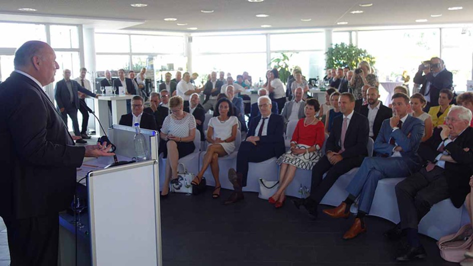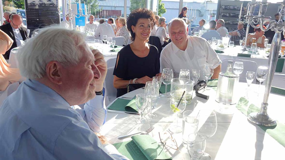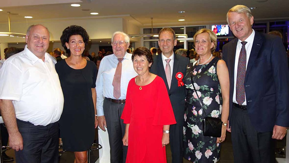 von 17: Auch Jan-Dieter Bruns, Geschäftsführender Gesellschafter der 500 ha großen Baumschule in Bad Zwischenahn (re.) und seine Frau gehörten zu den Gratulanten. Der Jubilar mit Gattin Katharina, Bernhard Vogel, Gastgeber Helmut Peter mit Frau Gabi Biermann.
