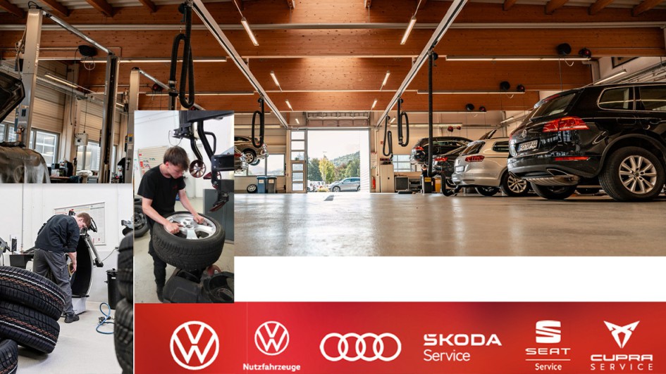 von 14: Ein Blick in die VW-Werkstatt: Holzgebälk gehört zur natürlichen Beschaffenheit im Allgäu. Aktuell läuft das Winterreifengeschäft. Von der Reifenhalle bis zur Montagestation sind für eine rasche Abfolge spezielle Prozesse entwickelt worden.