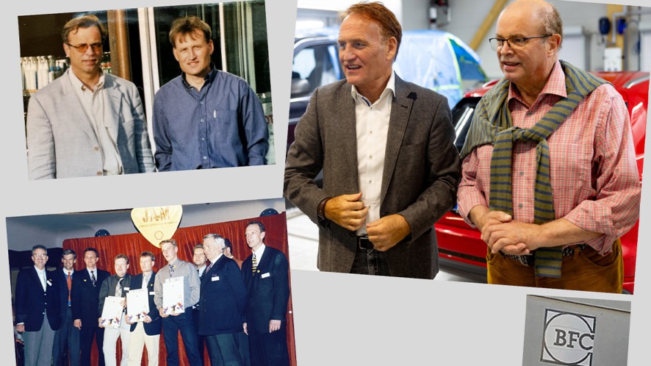 von 14: Es ist mir besondere Freude wie Ehre, Ronny Heuberger auch persönlich zum Firmenjubiläum zu gratulieren. Ich wünsche Dir weiterhin viel gutes Glück und viel Freude an deinem Wirken! Unsere Erstbegegnung geht auf die BFC Calw zurück, als ich dort von 1978 bis 1982 Dozent war. Als AUTOHAUS-Chefredakteur war - von München aus - Bernbeuren nicht aus der Welt und ich war interessiert, welche Impulse Ronny Heuberger zu Hause nach und nach setzt, vor allem in der IT-Welt. Bild o.li.: Wir machten von AUTOHAUS aus 1991 mit Shell einen Junior-Wettbewerb, "JAM" genannt. Der Fünfte von links ist Ronny Heuberger auf Platz eins. Seine innovative, kreative Spezialbegabung fiel damals schon auf. Der Dritte von links war der damals noch junge Ralph M. Meunzel, heute AUTOHAUS-Chefredakteur! Der Zweite von rechts ist der große Verleger von Schwacke, Helmut H. Lederer. Bild o. re.: der "alte" Prof. Hannes Brachat mit Ronny Heuberger bei seinem letzten Besuch in Füssen in der neuen Lackieranlage.