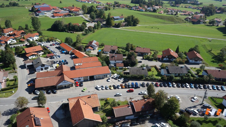 von 14: Das heutige Autohaus-Areal in Füssen im Gewerbepark Allgäuer Land umfasst 23.500 Quadratmeter Fläche. Dort entstanden 2012 der Neubau für VW und Audi, mit großem Gebrauchtwagenplatz. Ganz hinten steht die neu gebaute Lackiererei, die im Januar 2024 in der Hiebelerstraße in Betrieb genommen wurde.