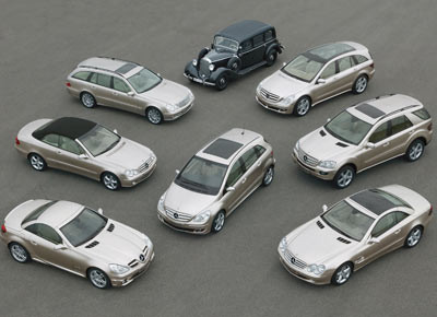 von 5: Diesel-Offensive: Mercedes-Benz präsentiert auf dem Automobilsalon in Genf im Jahr 2005 ein breites Angebot an Common-Rail-Fahrzeugen. Im Hintergrund der erste serienmäßige Diesel-Pkw Mercedes-Benz 260 D (Baureihe W 138,1936 bis 1940).