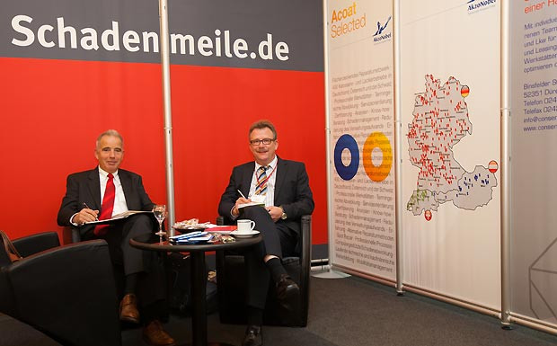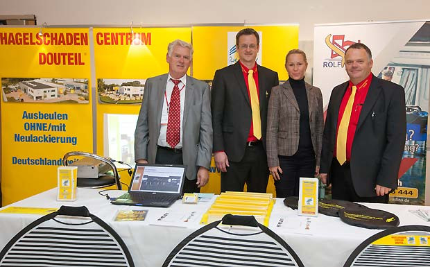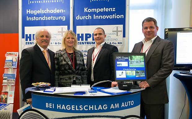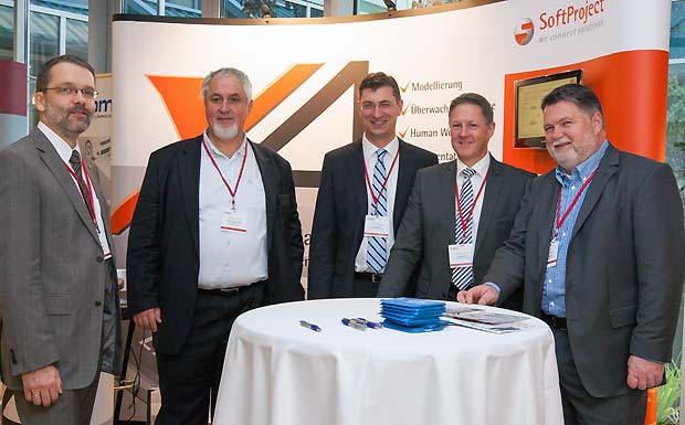 von 43: Am Stand von SoftProject (v.l.n.r.): Gerd Klaaßen, Chef-Sachverständiger HDI Versicherung AG, Hans-Joachim Koch, Abteilungs-Direktor Kraftfahrtschaden HDI Versicherung AG, WOM-Vorstand Dirk Detmer, Vertriebsleiter Daniel Seiler und Ralf Wiegand, HDI Versicherung AG Bereich Kraftfahrt Schaden