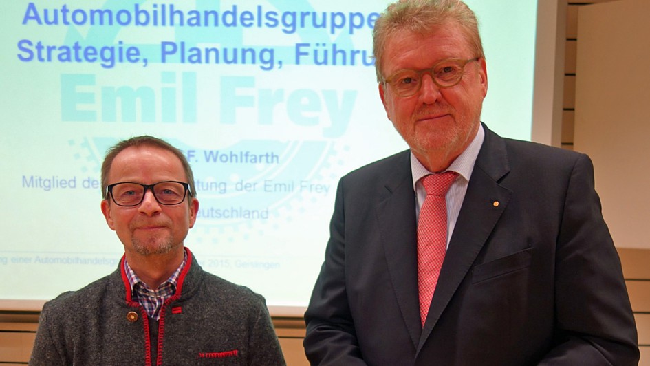 von 15: Seine Vorträge an der Hochschule für Automobilwirtschaft in Geislingen in der Aula der Hochschule wurden stets von Studiendekan Prof. Stefan Reindl eröffnet.