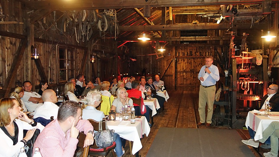 von 15: Rudolf Wohlfarth begrüßt seine 80 Gäste, Freunde, Berufsbegleiter und Begleiterinnen mit einer Replik auf seine 22 Jahre beruflichem Wirken in der Emil Frey Gruppe.