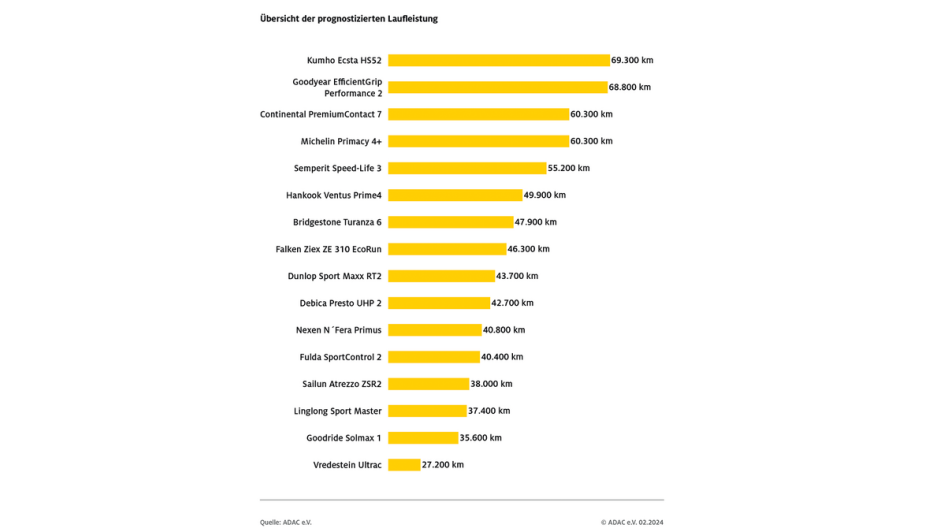 von 4: Ein Überblick zur Laufleistung der getesteten Sommerreifen 2024. In Hinblick auf die Laufleistung erzielen die 17 Testkandidaten recht unterschiedliche Niveaus.