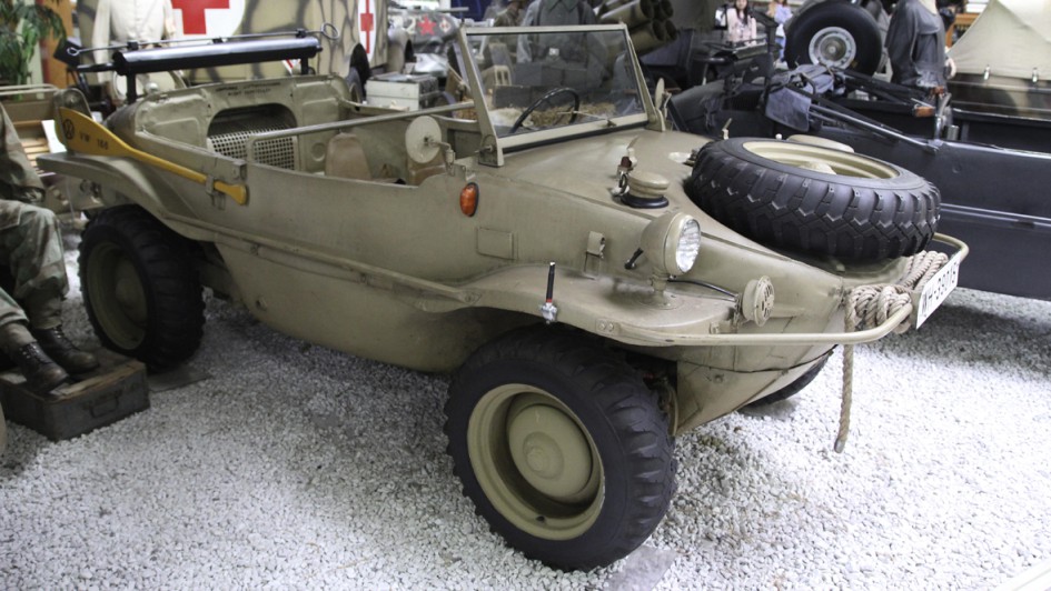 von 8: Im 2. Weltkrieg waren Amphibienfahrzeuge für den schnellen Vormarsch interessant. Bekannt ist beispielsweise der ab 1942 gebaute VW Typ 166 Schwimmwagen, von dem über 14.000 Exemplare gebaut wurden.