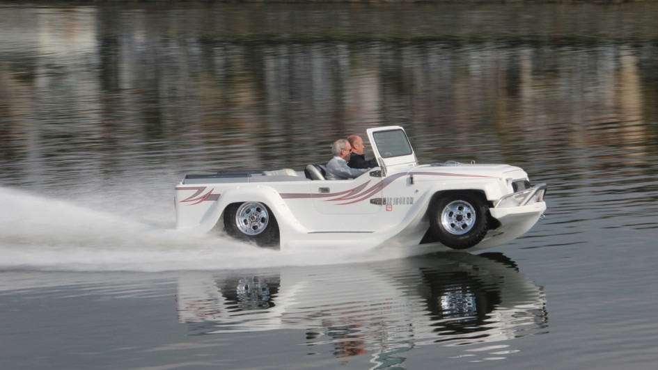 von 8: Seit über 200 Jahren sind Tüftler fasziniert von der Idee, Landfahrzeuge auch als Boote zu nutzen. Im Bild: der Berliner Konstrukteur Paul Mönch bei einer Demonstrationsfahrt im Tegeler See (1950).