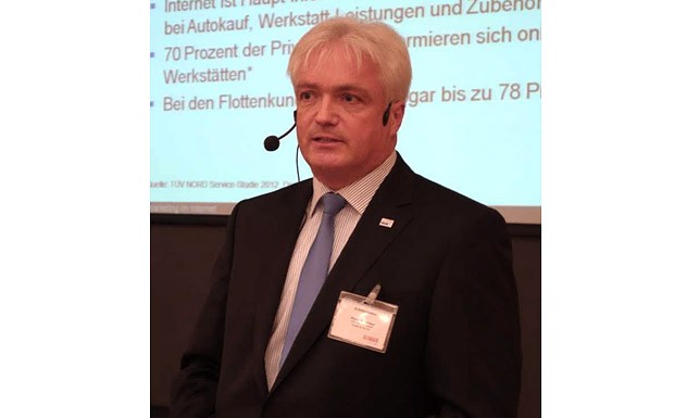 von 29: Klaus Jürgensen, Bereichsleiter Vertrieb, TÜV Nord Mobilität, seit Jahren Sponsor der Veranstaltung, sprach anhand kreativ und optisch ansprechend gestalteten Charts zum Thema Servicevermarktung im Internet. Zwei Aussagen: "Autoscout24 tritt mit den größten Chancen auf, sich als Standardportal für Werkstattleistungen zu platzieren. Für alle Teilnehmer im automobilen Servicegeschäft ergeben sich durch die Werkstattportale Potenziale."