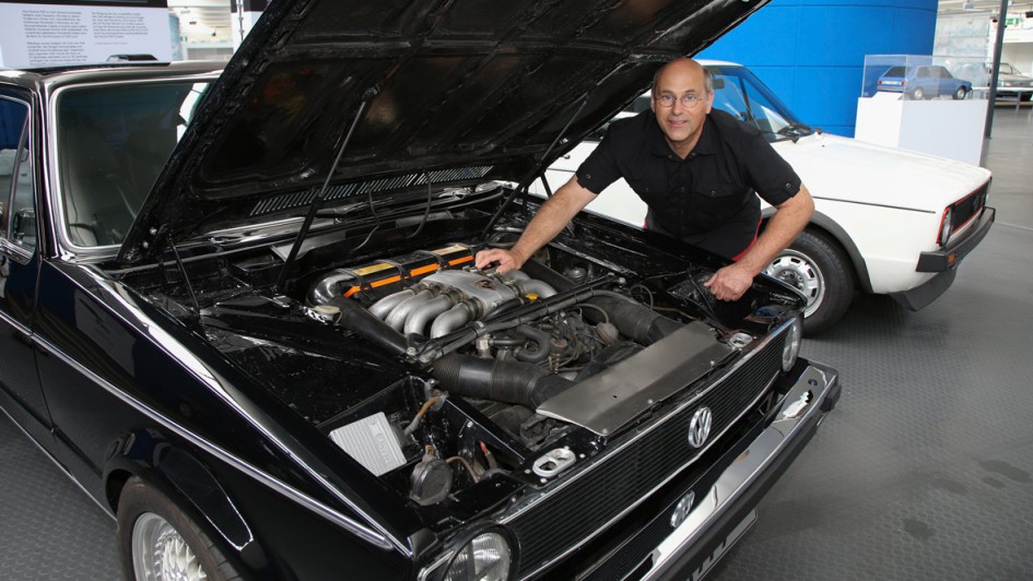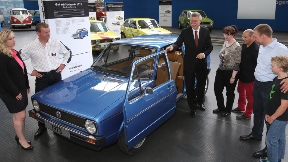 von 5: 40 Jahre Golf: Im Automuseum von Volkswagen läuft noch bis 5.10. eine Jubiläums-Ausstellung. Im Bild: Einige der Leihgeber der Ausstellung mit dem Ausstellungs-Logo bei der Eröffnung.