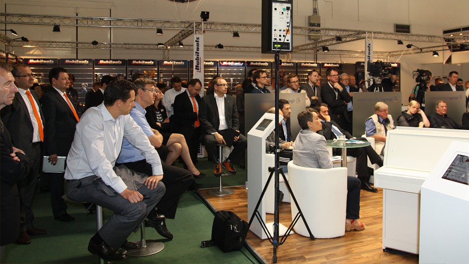 von 5: Anlässlich der Automechanika 2014 in Frankfurt diskutierten Branchenprofis mit AUTOHAUS-Chefredakteur Ralph M. Meunzel (l.) die Vorteile der digitalen Dialogannahme.