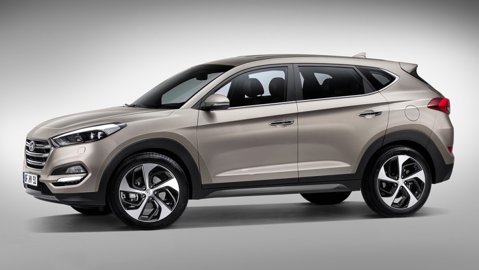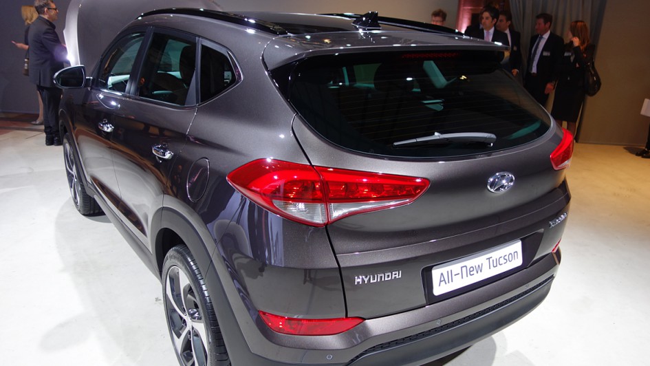 von 12: Die breite Öffentlichkeit muss sich noch bis zum Genfer Autosalon Anfang März gedulden, Händler und Journalisten durften schon einmal vorab einen Blick auf den neuen Hyundai Tucson werfen. V.l.n.r.: Olaf Jahr (ASL Auto-Service Lichtblau), Patrick Schulz (Hyundai), Manfred Eggert (Auto Eggert) und Frank Thomas Dietz (Hyundai)