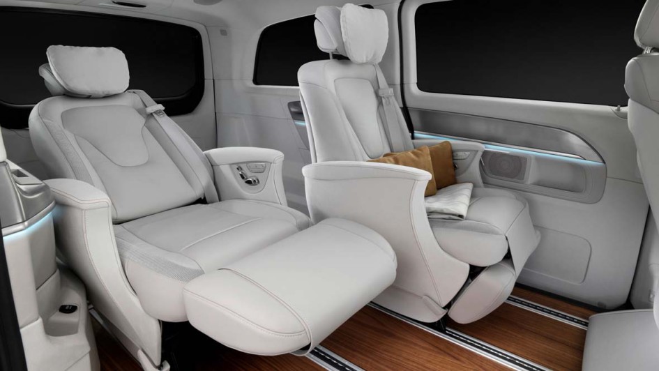 von 4: Die neu V-Klasse hat sich bereits zum Edel-Shuttle entwickelt. Mit einem Konzeptauto zeigt Mercedes auf dem Genfer Automobilsalon (bis 15. März), wie die Großraumlimousine in naher Zukunft ausgestattet sein kann