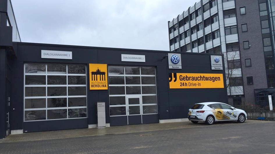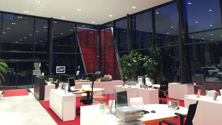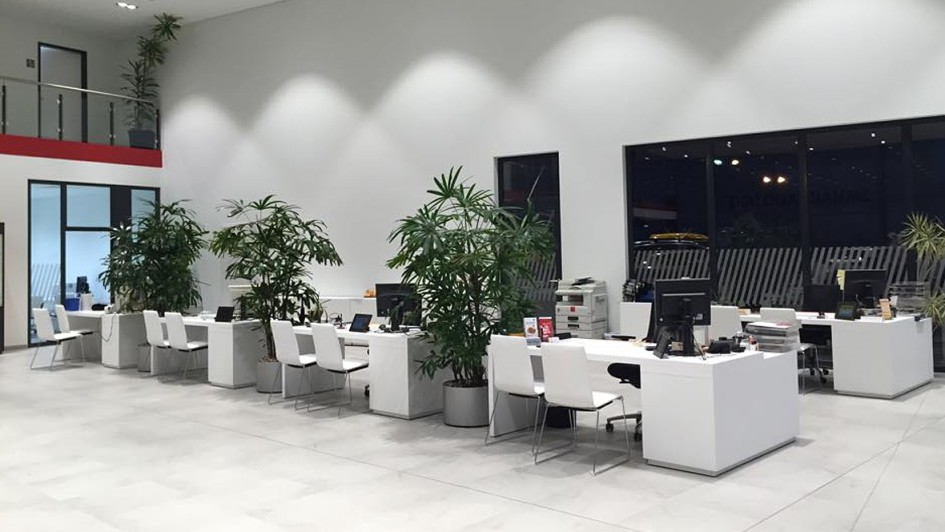 von 11: Der zweigeschossige Prestigebau bietet auf 11.120 Quadratmetern Gesamtfläche einen lichtdurchfluteten Showroom, zwei Direktannahmen mit Achsvermessung-Arbeitsplätzen, ein Aufbereitungszentrum für Großkunden, zwei Waschstraßen sowie eine Hebebühnen für Nutzfahrzeuge und Sportwagen.