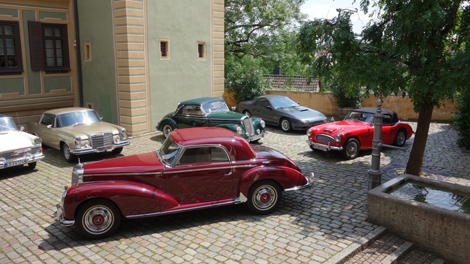 von 12: Oldtimer sorgten für weitere emotionale Elemente des Messegeschehens: vom Fiat Spider, Mercedes W 187 Cabrio, Austin Healy u.a. Man achte auf die historische Kulisse. Sehnsucht pur!