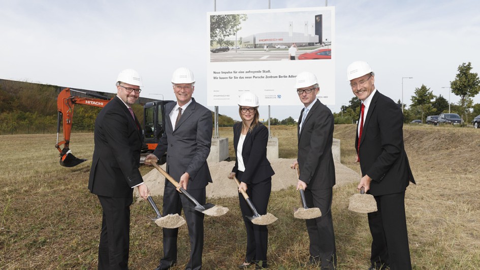 von 3: Spatenstich (v.l.n.r.): Patrick Henkel Geschäftsführer Porsche Niederlassungen Berlin. Jens Puttfarcken, Vorsitzender Porsche Deutschland GmbH, Jana Wulf, Project Manager RE Management & Development, Staatssekretär Guido Beermann, Senatsverwaltung für Wirtschaft, Technologie und Forschung, und Roland Stöckigt ,Vorsitzender Volkswagen Immobilien GmbH