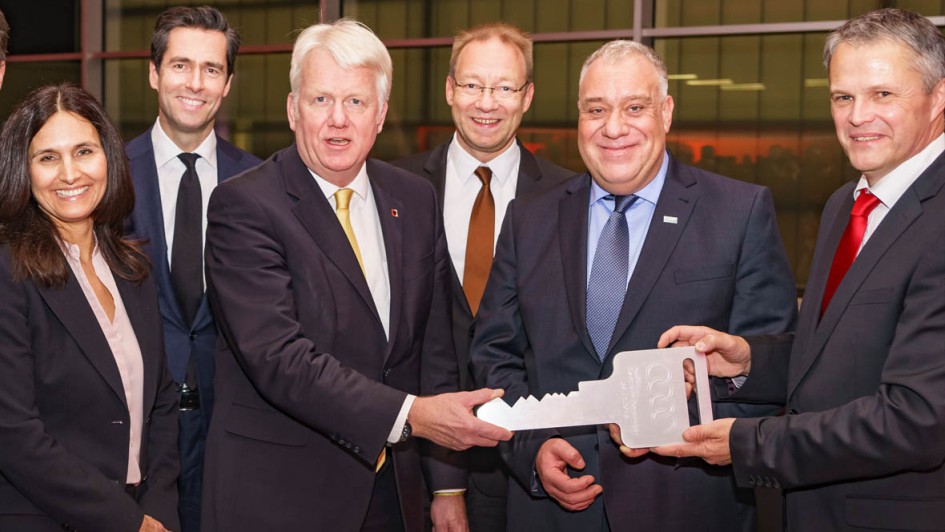von 15: Schlüsselübergabe: Michael Sprenger, Geschäftsführer Hülpert Unternehmensgruppe, Jörg Schiffer, Firma Habau, Stefan Schreiber, Geschäftsführer der IHK Dortmund, Dortmunds Oberbürgermeister Ullrich Sierau, Hülpert Gesellschafterrat Ralf Kreutzberg und Hülpert Gesellschafterin Eva Kreutzberg.