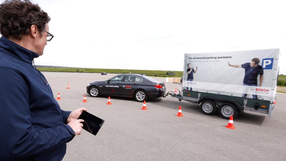 von 10: Sogar Auto plus Anhänger lassen sich über das Smartphone in eine Parklücke dirigieren – während man zugunsten einer besseren Übersicht daneben steht