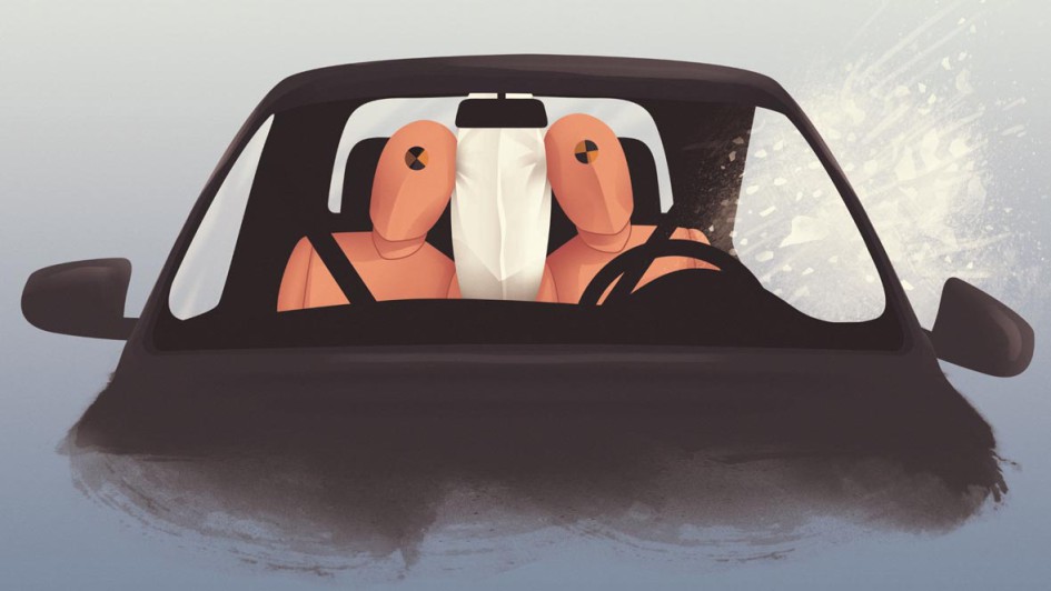 von 10: Wenn Warnungen zu spät kommen, werden die Insassen in Zukunft von neuartigen Airbags geschützt: Zulieferer ZF TRW beispielsweise hat ein Luftkissen entwickelt, das sich zwischen Fahrer und Beifahrer entfaltet