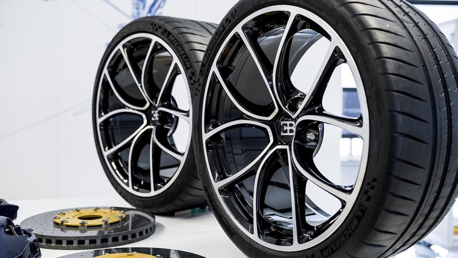 von 18: Die speziell für den Chiron entwickelten Michelin-Reifen sind vorsichtshalber bis 470 km/h getestet, in der Spitze sogar bis 490 km/h. Übrigens auf einem Reifenprüfstand für Flugzeuge.