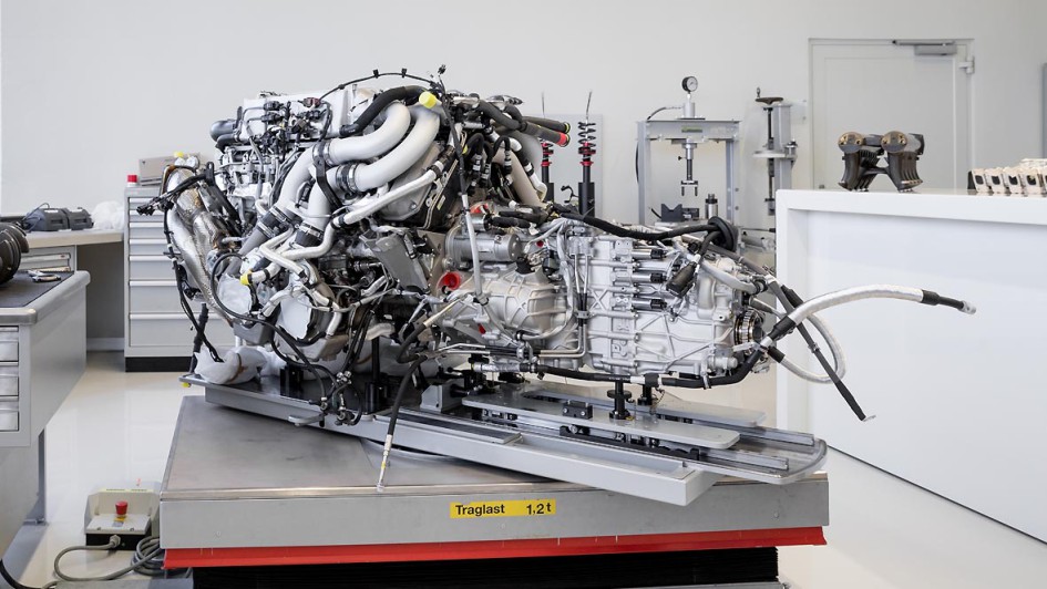 von 18: Möglich macht die kaum zu fassenden Dimensionen das 1.500-PS-Aggregat: W16-Motor mit acht Litern Hubraum und vier Turboladern, 436 Kilo schwer, hier mit Getriebe.