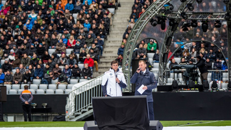 von 10: Gut 35.000 am Stammsitz beschäftigte BMWler verfolgten die Feierlichkeiten bei Currywurst und Pommes in der Allianz-Arena - vor Ort war unter anderem DTM Fahrer Bruno Spengler.