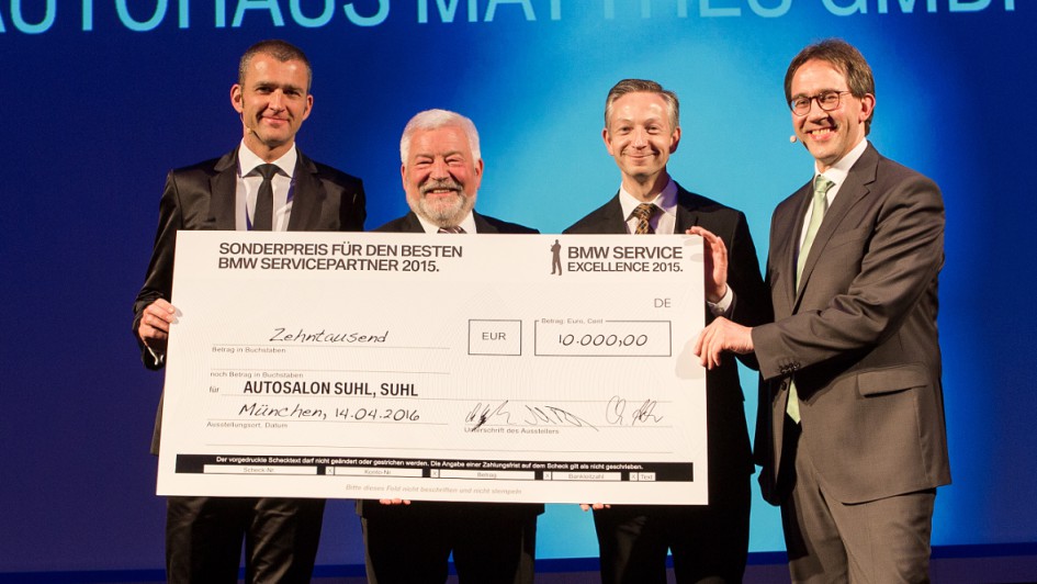 von 7: v.l.n.r.: Christian Ach, Leiter Mini Deutschland, Peter Matthes, Geschäftsführer der Autosalon Suhl GmbH und der Autohaus Matthes GmbH, Christian Scheppach, Leiter Aftersales BMW Group Deutschland und Andreas Biehler, Leiter Entwicklung Vertriebswege und Kundenbeziehungen BMW Group Deutschland