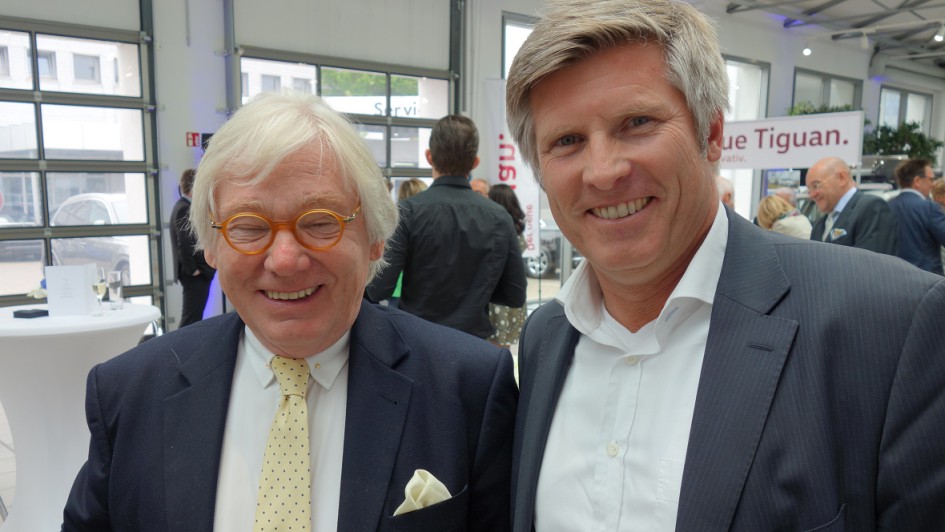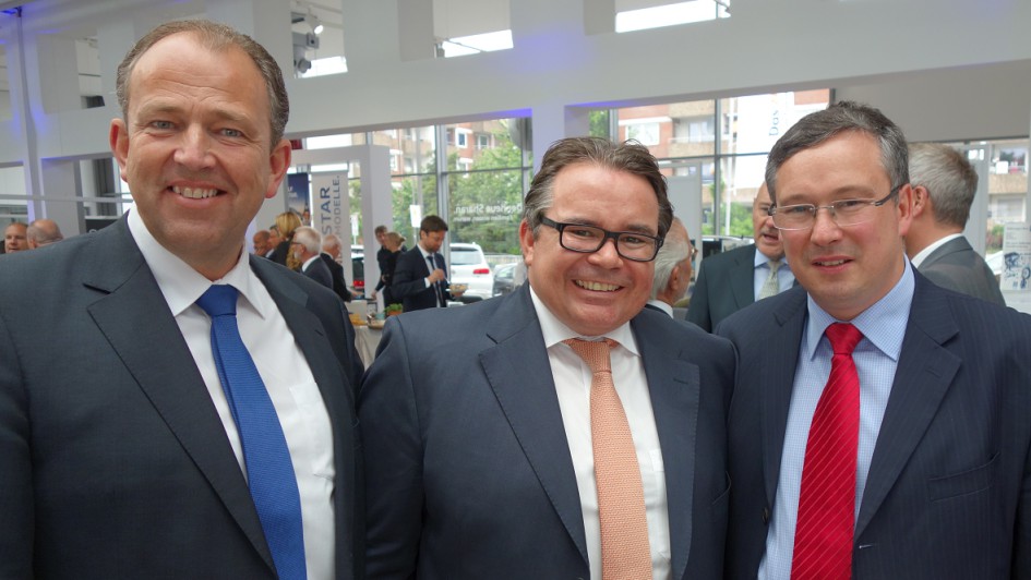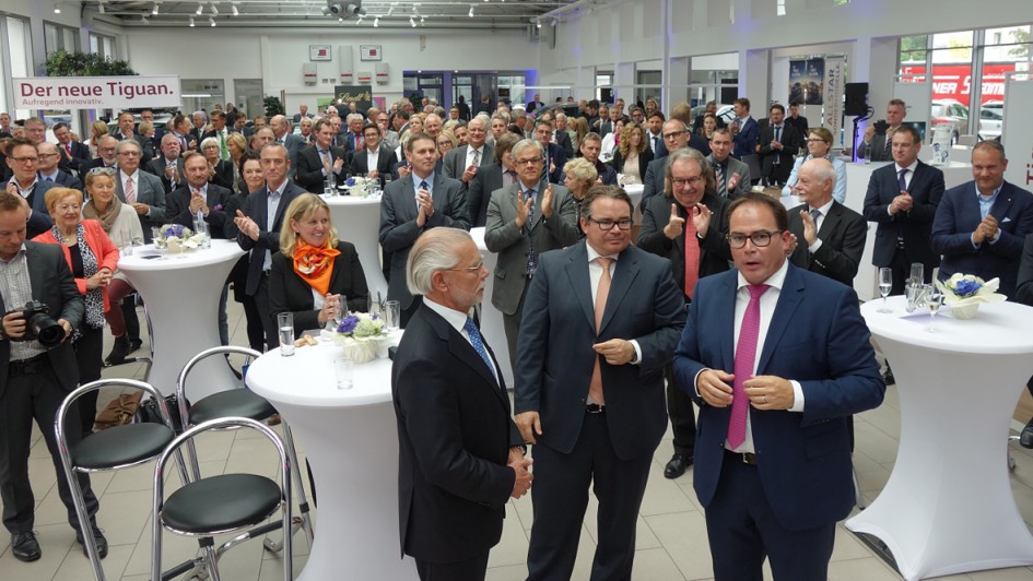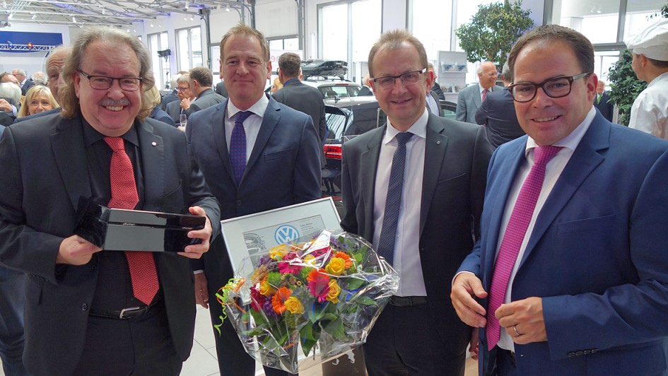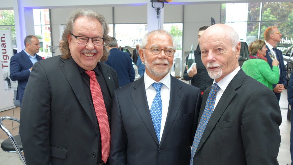von 16: Günter Jakobs und Emmerich Engels mit dem Mann, der 1986 den Händlervertrag im Hause Volkswagen für Jakobs durchsetzte, Alfred Meissner (r.).