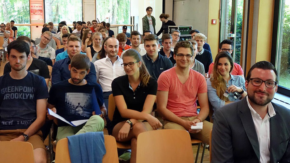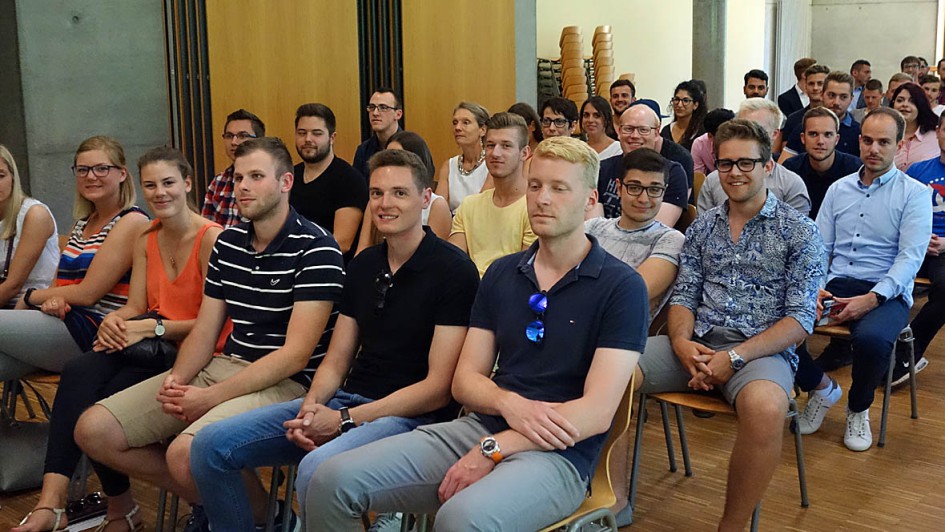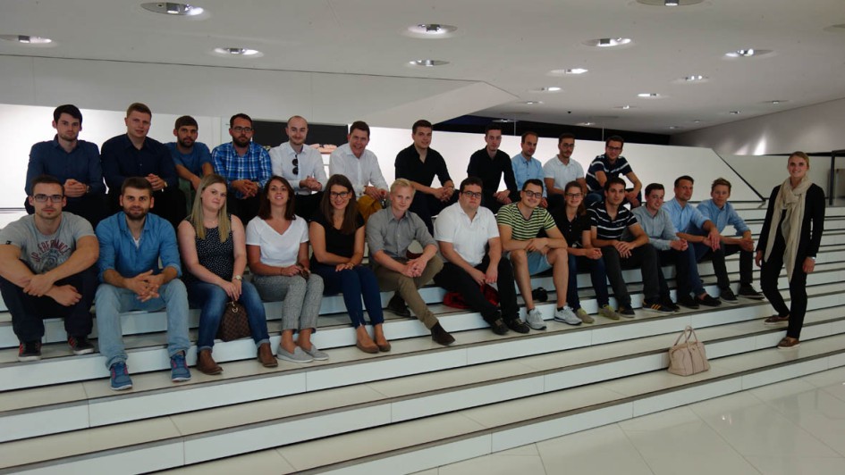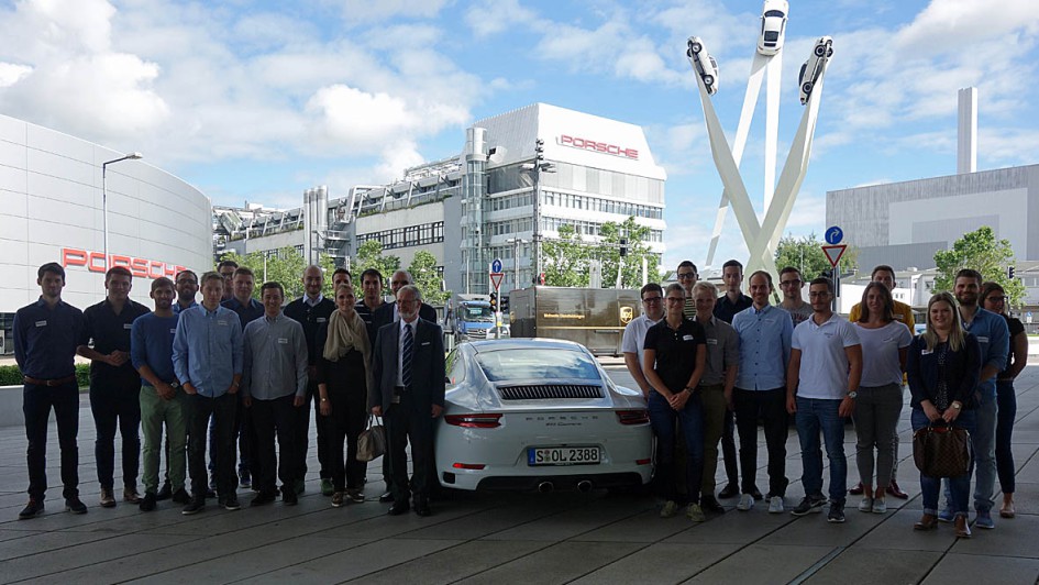 von 18: Die Brücke zum Besuch am Porscheplatz 1 in Zuffenhausen baute Porsche-Deutschland-Chef Jens Puttfarken. Er stellte Lana Calovini aus der Personalabteilung von Porsche Deutschland und seinen Assistenten, Denis Bettenmann für diesen Besuch ab. L. Calovini (r.), Betreuerin für die jährlich 80 Praktikanten und Praktikantinnen bei Porsche Deutschland, informierte die Studentenschaft über die Porsche-Personalpolitik und stand für zahlreiche Fragen zur Verfügung.