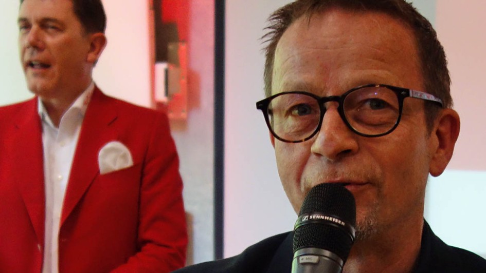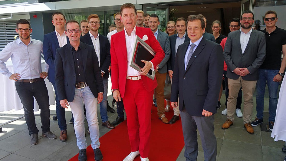 von 18: Anclam bewies mehr als einmal seine originelle und offene Schlagfertigkeit auf direkte Fragestellungen und erhielt mehrmals begeisternden Szenenapplaus. Der "rote Anzug" und die "weißen Schuhe" stehen für Anclams Firmenfarben. Inklusive Krageninsignien.
