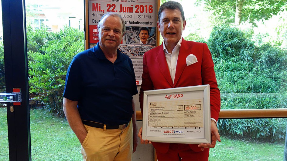 von 18: Einmal mehr überreichte Anclam an AUTOHAUS-Herausgeber Prof. Hannes Brachat einen Scheck in Höhe von 20.000 Euro für dessen Hochschulwirken.