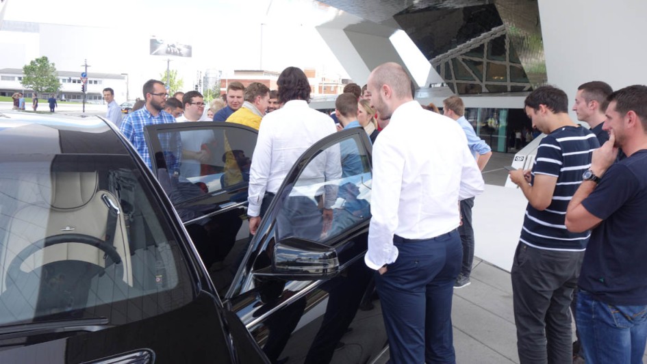 von 18: Werksbesichtigung! Früh um 9:45. Dauer: zwei Stunden. Pro Jahr beteiligen sich 60.000 Interessierte an einer Werksführung. Außerdem holen 5.000 Fans aus allen Ländern hier ihre Neuwagen im Auslieferungszentrum ab. Die beiden Werksführer, Volker Spannagel und Walter Treer führten die Studenten und Studentinnen durch den Karosseriebau, die Inszenierung Armaturenbrett – mit Handnähten -, Motorenbau, Frontglasmontage mit Kuka-Robotern bis zum Höhepunkt der Hochzeit, der Vereinigung "der Motor und die Karosserie"! Fotografieren verboten. Ebenso herrschte Handyverbot.