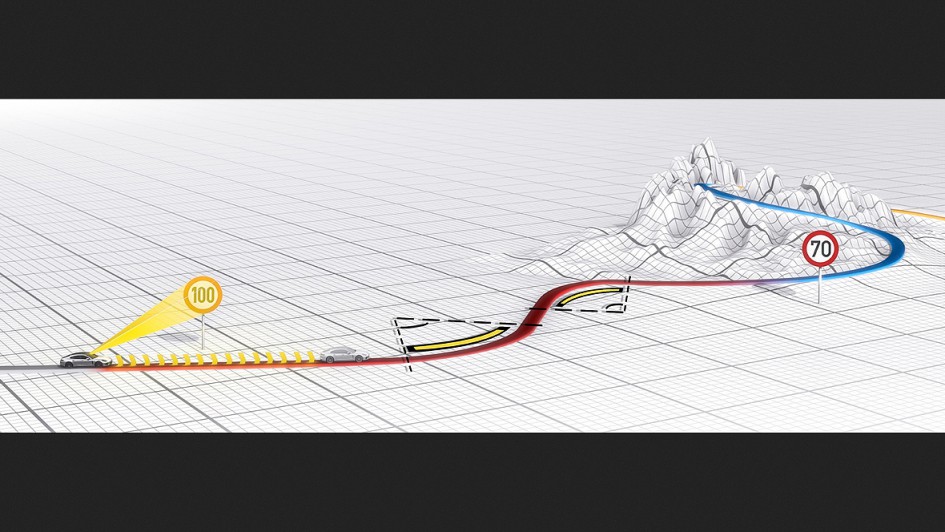 von 16: Auch neu: ein Abstands-Tempomat, der in Zusammenarbeit mit dem Navigationssystem bis zu drei Kilometer nach vorne schaut und schon weiß, dass bald ein Tempolimit kommt, ehe man das Schild überhaupt sehen kann.
