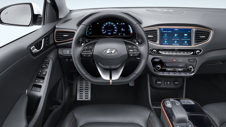 von 4: Im Innenraum des Ioniq herrscht ein sachlich-funktionales Ambiente - mit umweltfreundlichem Hintergrund.