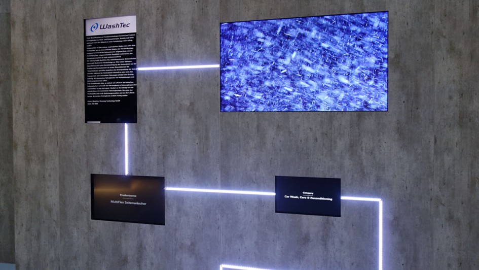 von 32: Von besonderer Klasse war die Präsentationswand zum Innovation Award. Hier konnte sich der Messebesucher über einen zu steckenden "Klotz" seine gewünschte Innovation aussuchen und wurde dann visuell in vorbildlicher Darstellung informiert. Hier die "Multiflex Seitenwäsche" von Washtec. Wer kennt die Geschichte um Kleindienst, Wesumat-California nicht? Das waren früher alles eigenständige Aussteller.